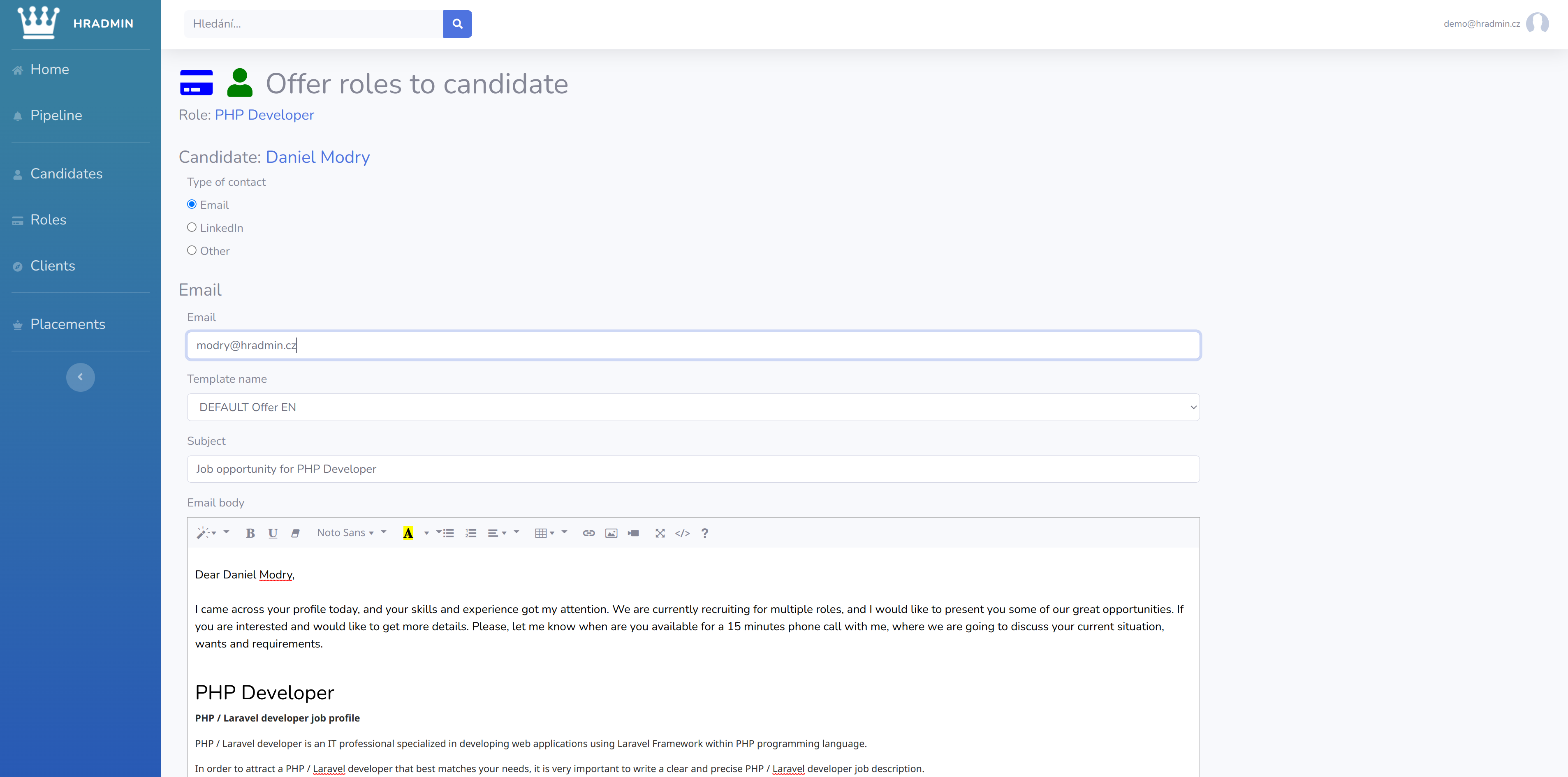Clear in one place. After displaying the candidate, suitable positions are offered with the option to send the offer of the given position directly